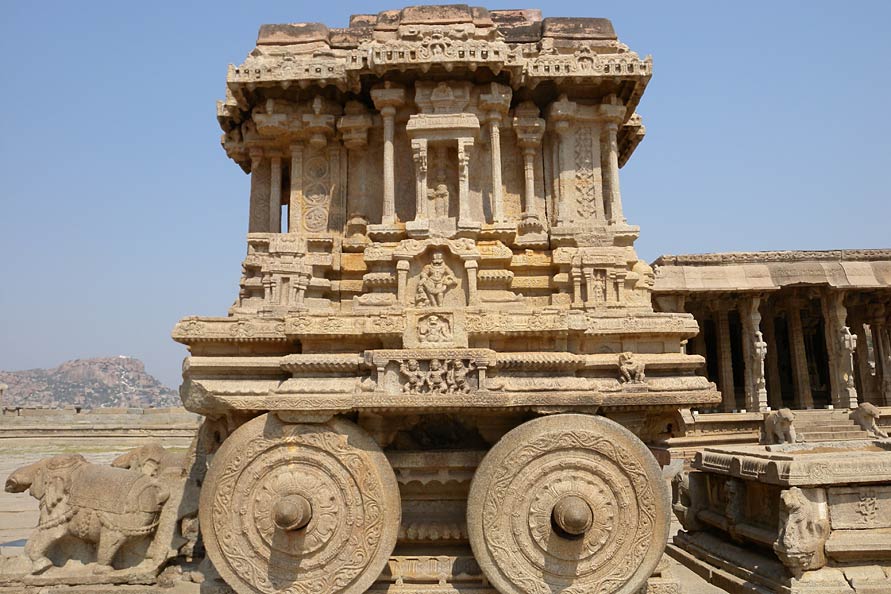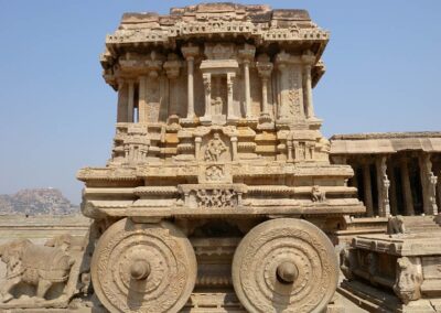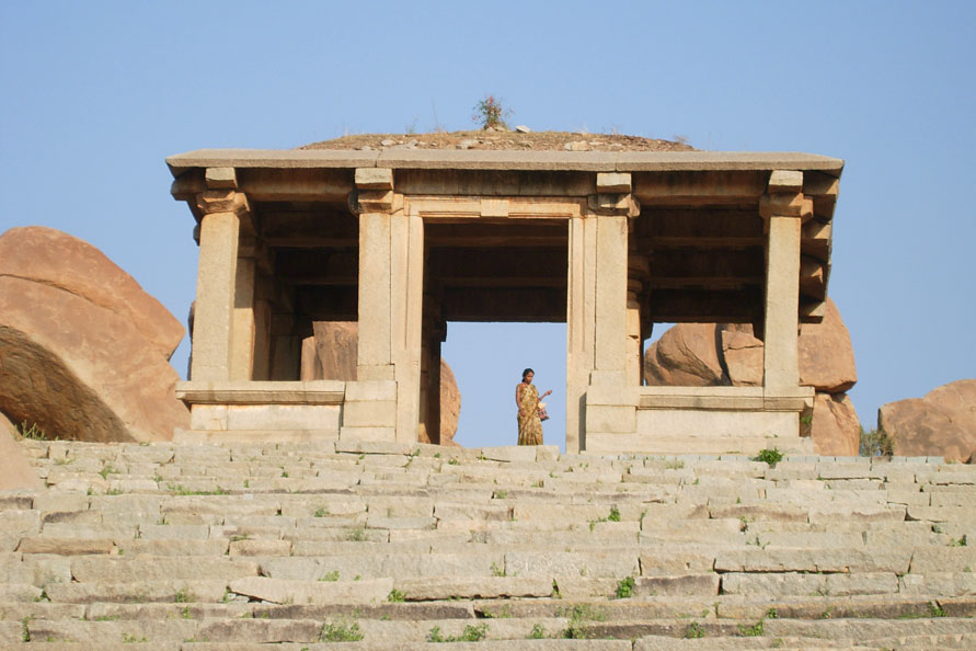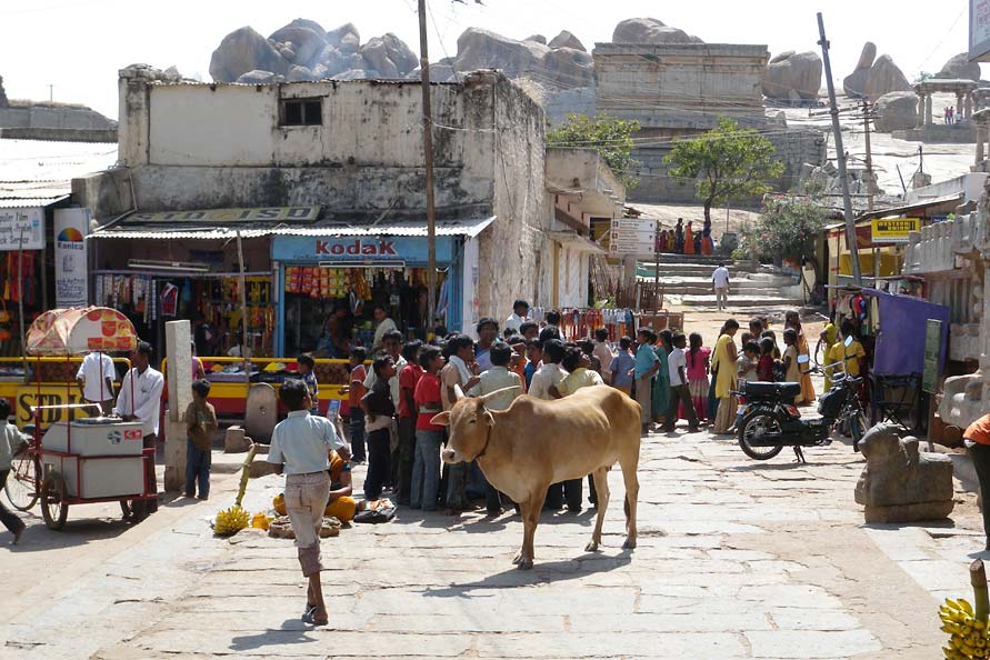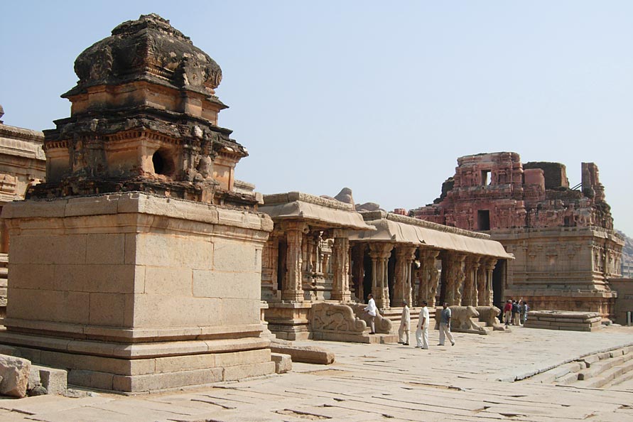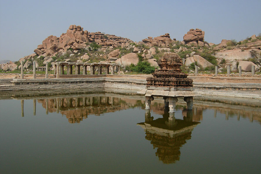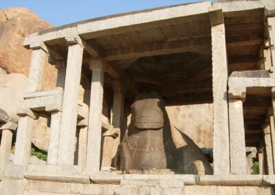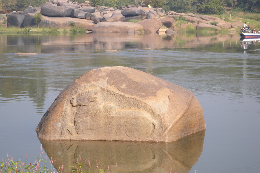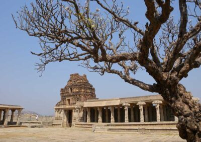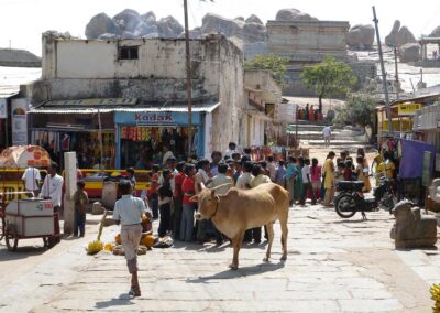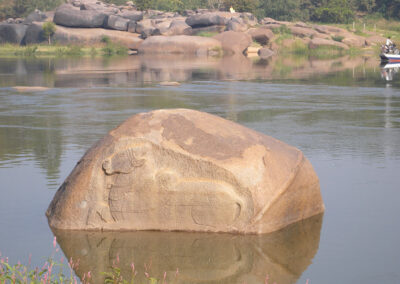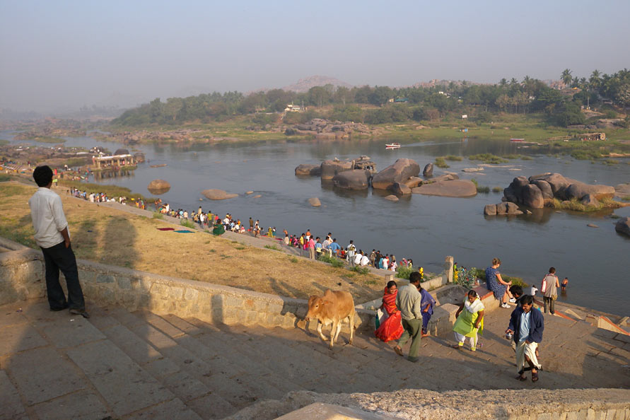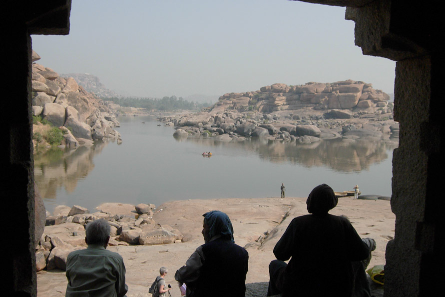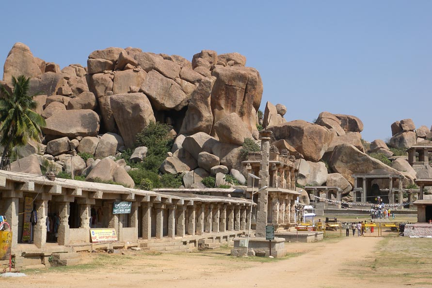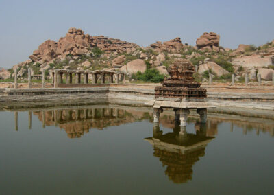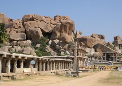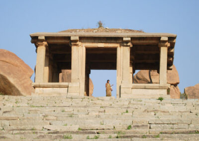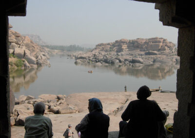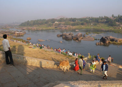 Ham­pi liegt im Bun­des­staat Kar­natakaam Ufer des Flus­ses Tung­ab­ha­dra. Im 14. bis 16. Jahr­hun­dert war Ham­pi die Haupt­stadt des König­rei­ches Vija­ya­na­gar, eines der letz­ten gros­sen Hin­du-Rei­che. Ham­pi zählt heu­te nur noch ca. 2’000 Ein­woh­ner, die Paläs­te und Fes­tungs­mau­ern der ehe­ma­li­gen Rie­sen-Stadt sind mehr oder weni­ger zer­stört wor­den. Geblie­ben sind zahl­rei­che wun­der­schö­ne Tem­pel und gan­ze Tem­pel­an­la­gen (Viru­pak­s­ha, Achyu­t­ara­ya, Lotus-Palast…), die Ham­pi nicht zu Unrecht zu einem UNESCO-Welt­kul­tur­er­be machen.