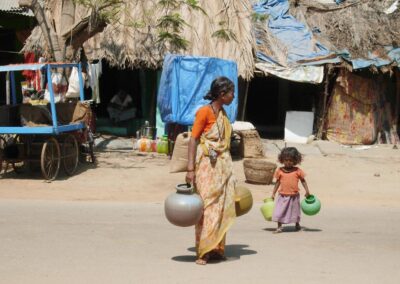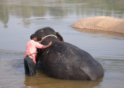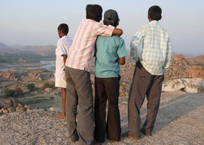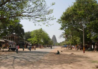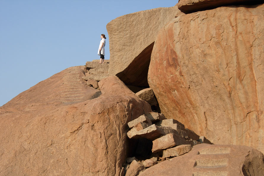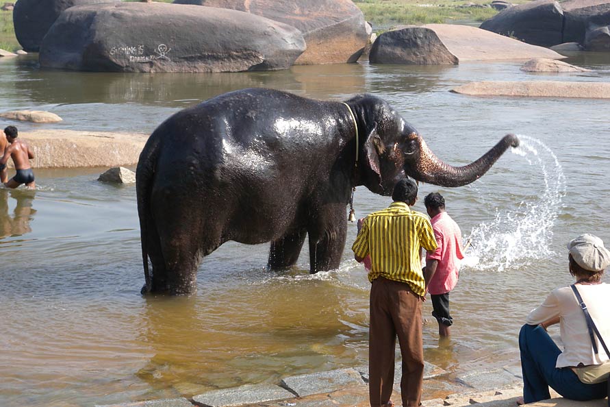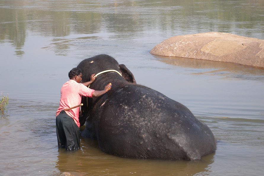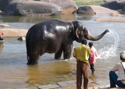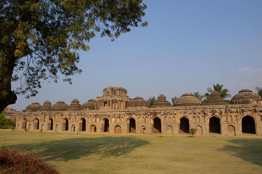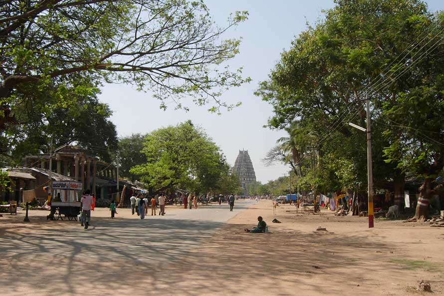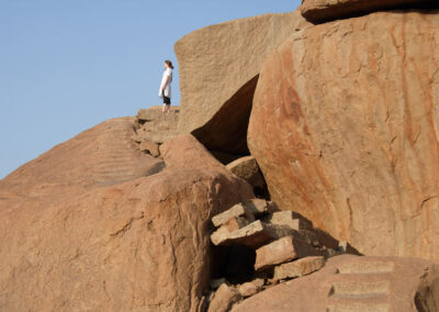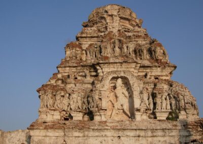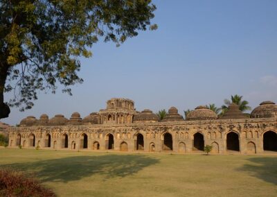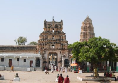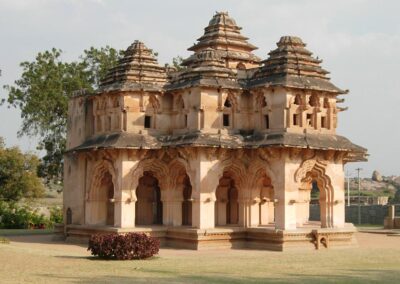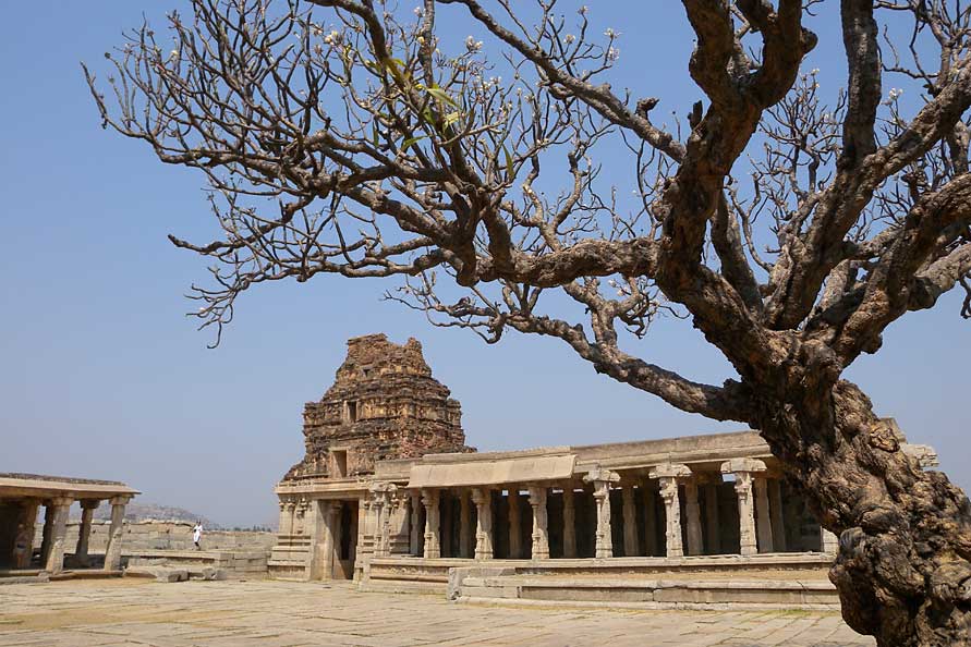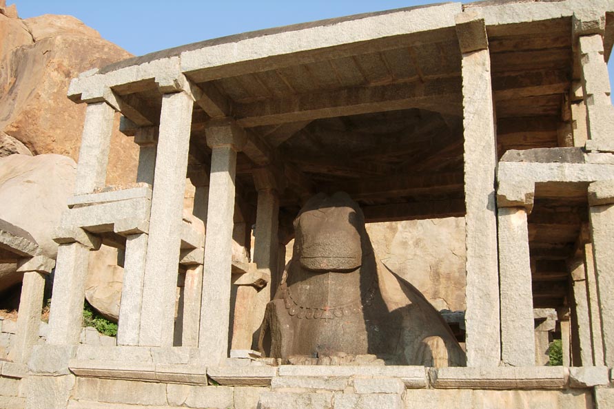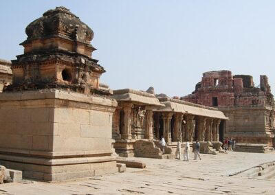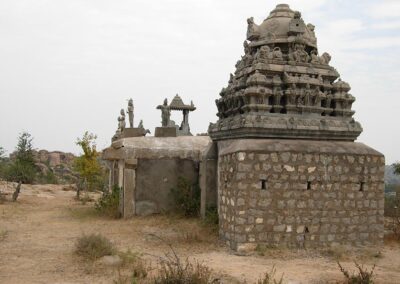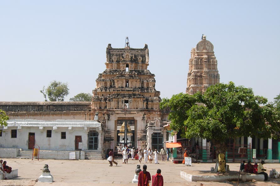 Ham­pi liegt im Bun­des­staat Kar­natakaam Ufer des Flus­ses Tung­ab­ha­dra. Im 14. bis 16. Jahr­hun­dert war Ham­pi die Haupt­stadt des König­rei­ches Vija­ya­na­gar, eines der letz­ten gros­sen Hin­du-Rei­che. Ham­pi zählt heu­te nur noch ca. 2’000 Ein­woh­ner, die Paläs­te und Fes­tungs­mau­ern der ehe­ma­li­gen Rie­sen-Stadt sind mehr oder weni­ger zer­stört wor­den. Geblie­ben sind zahl­rei­che wun­der­schö­ne Tem­pel und gan­ze Tem­pel­an­la­gen (Viru­pak­s­ha, Achyu­t­ara­ya, Lotus-Palast…), die Ham­pi nicht zu Unrecht zu einem UNESCO-Welt­kul­tur­er­be machen.