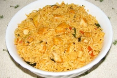 Einen schweren Topf mit etwas Ghee bestreichen und die Fischfilets hineinlegen. Eine Schicht Reis, Rosinen und Cashewnüsse daraufgeben. Die Zutaten in dieser Reihenfolge weiter in den Topf schichten, bis sie aufgebraucht sind, mit Rosinen und Cashewnüssen abschliessen. Einen Deckel auflegen und das Gericht bei sehr schwacher Hitze etwa 5 Minuten ziehen lassen.